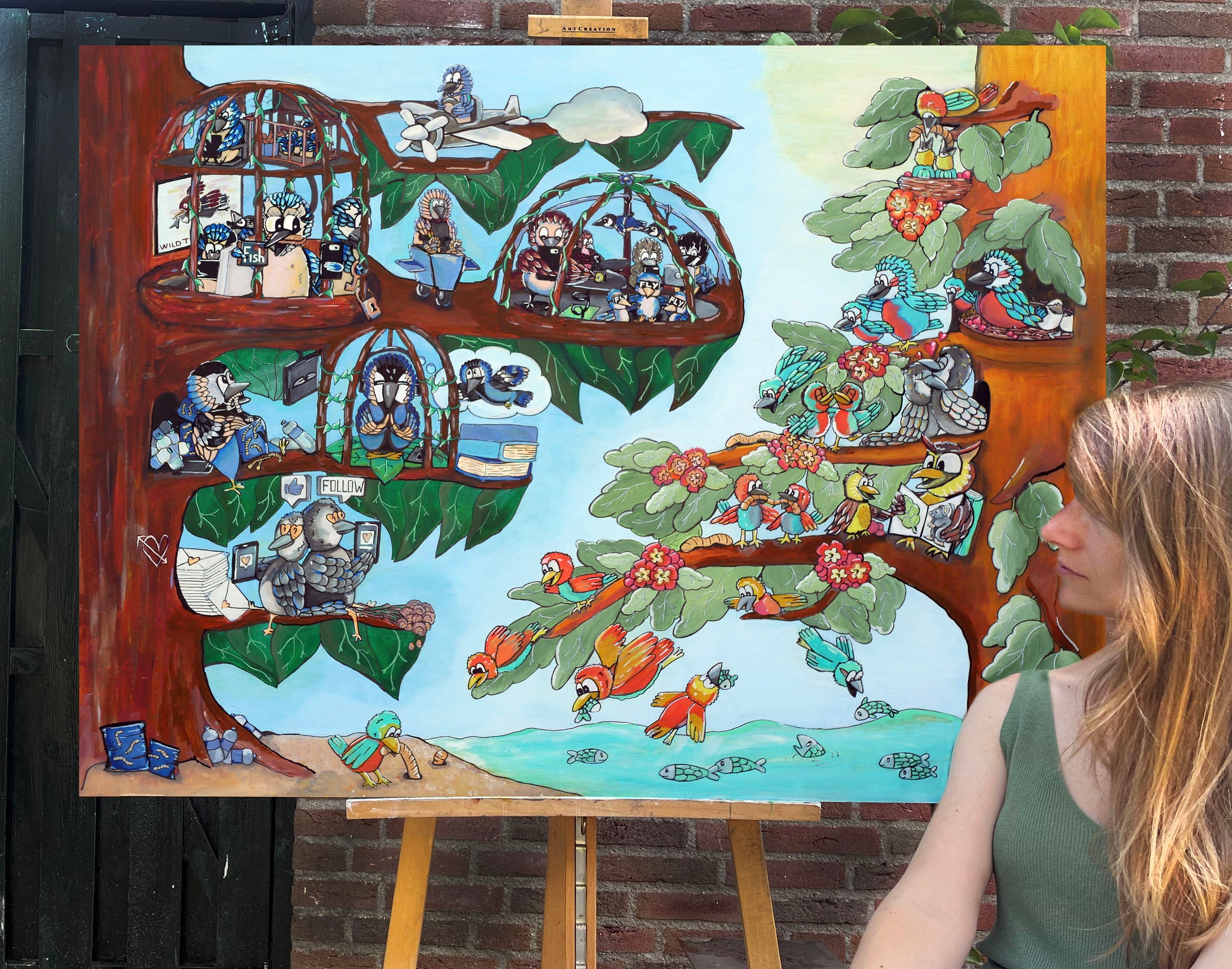 ๐๐ป ๐บ๐ถ๐ท๐ป ๐ป๐ถ๐ฒ๐๐๐๐๐ฒ ๐๐ฐ๐ต๐ถ๐น๐ฑ๐ฒ๐ฟ๐ถ๐ท ๐๐๐ฎ๐ฎ๐ป ๐๐๐ฒ๐ฒ ๐ฏ๐ผ๐บ๐ฒ๐ป ๐ป๐ฎ๐ฎ๐๐ ๐ฒ๐น๐ธ๐ฎ๐ฎ๐ฟ. ๐๐ฒ ๐น๐ถ๐ป๐ธ๐ฒ๐ฟ ๐ฏ๐ผ๐ผ๐บ ๐๐ถ๐ ๐๐ผ๐น ๐๐ผ๐ด๐ฒ๐น๐ ๐ฑ๐ถ๐ฒ โ๐ฎ๐น๐น๐ฒ๐โ ๐ต๐ฒ๐ฏ๐ฏ๐ฒ๐ปโฆ behalve vrijheid. Ze scrollen, swipen, consumeren en dromen via schermen van vliegen, terwijl de lucht om hen heen wijd open is. Ze spelen influencer voor vissticks, terwijl de echte vis gewoon onder hen door het water zwemt. Ze leven in kooien met comfort en schermen, te druk met werk, tv, likes, filters en volgers om te merken dat hun vleugels er nog gewoon zijn. Ook blijft de kooi dicht bij de mediterende vogel die visualiseerd hoe het zou zijn om vrij te zijn. En zelfs de tortelduiven zoeken liefde en aandacht online, terwijl ze al naast elkaar zitten.