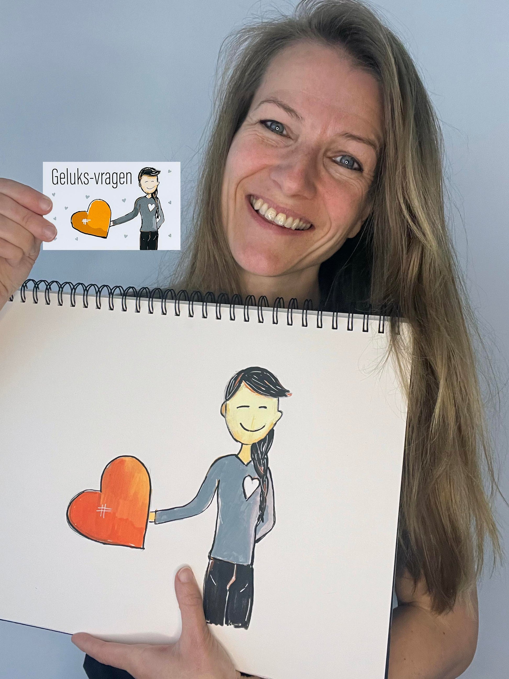 Geluks-vragen zijn prachtig zelf geïllustreerde kaartjes met in totaal 16 inspirerende vragen en subvragen om te reflecteren, verbinden én plezier te hebben.